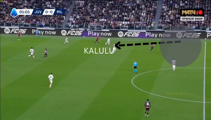This forced Kalulu, Juventus’ RWB, to push up and cover Bartesaghi, leaving space behind the French wingback. Bartesaghi plays a quick one-two with Adrien Rabiot and exploits the space behind Kalulu.