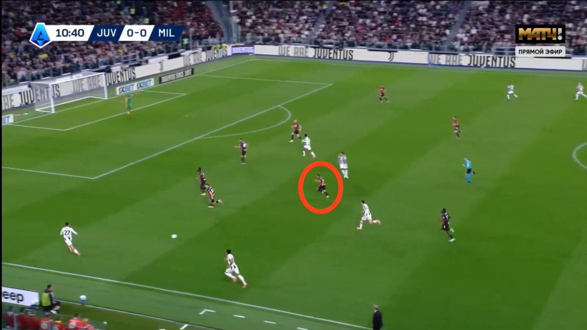 I really believe Gimenez worked really hard in his time in the match and made the Juventus defender toil to progress the ball here. Here we can see Gimenez cutting off the passing lane to Locatelli, Juventus’ regista, while once he went off, both Rafael Leao and Christopher Nkunku allowed Locatelli to receive the ball and turn.