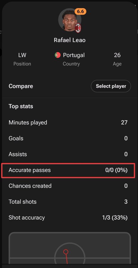 Lastly, I know a lot of Leao bashing has happened. But what worried me the most was how he had 0 passes in the 27 minutes he played. He attempted 0 passes and had 0 passing accuracy.